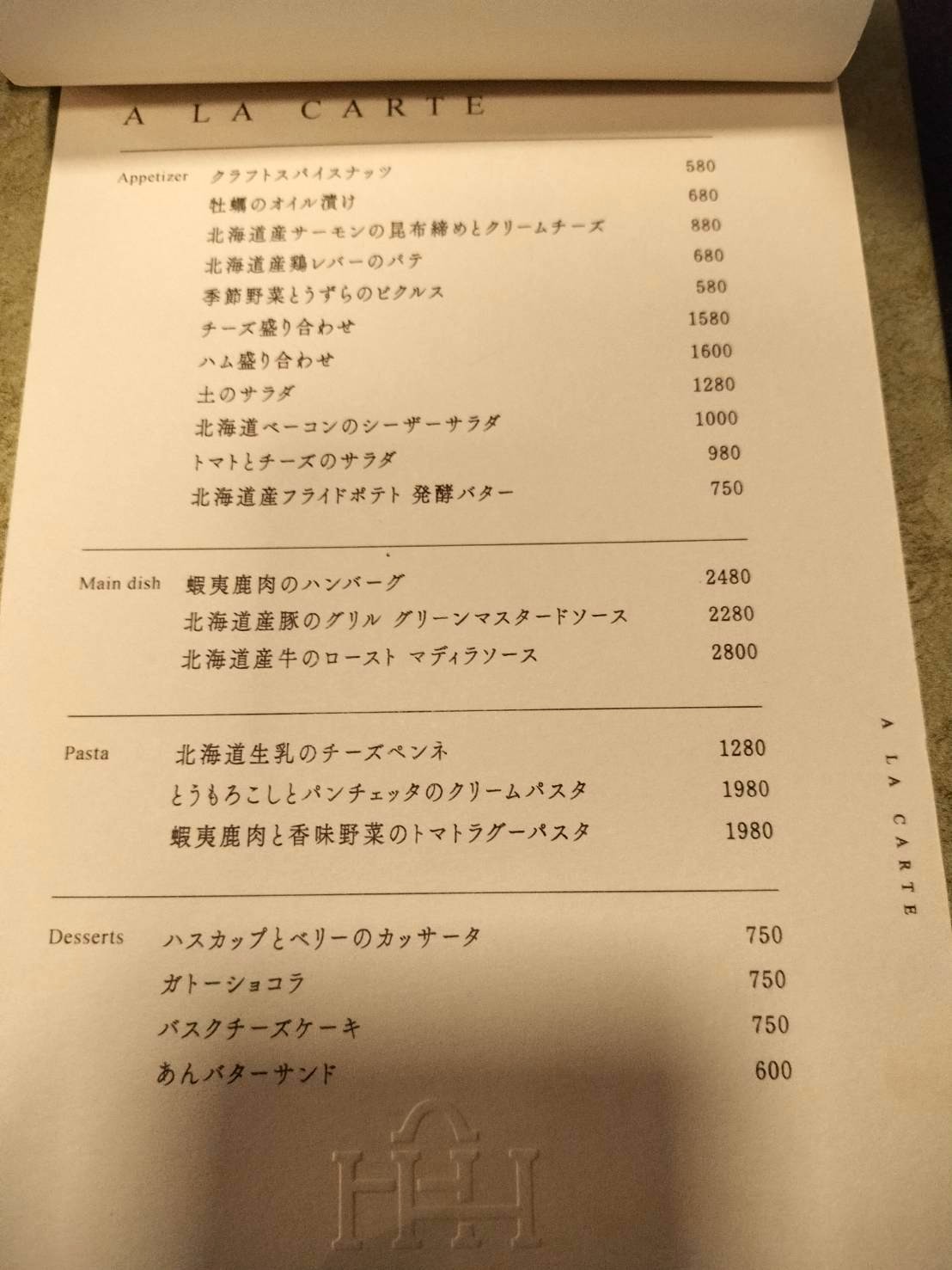 HOUSE.Hのメニュー構成と予算目安です。赤れんが庁舎内という立地もあり、アラカルトを中心に、カフェからディナーまで幅広い時間帯で利用できます。